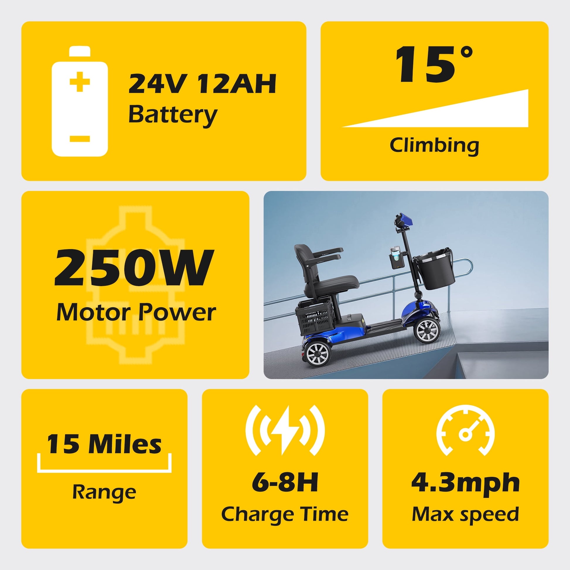 EAGLOG Upgrade 4 Wheels Mobility Scooter with Removable Battery, Compact Heavy Duty Mobile for Travel, Foldable Powered Wheelchair for Adult, 330lbs, Blue